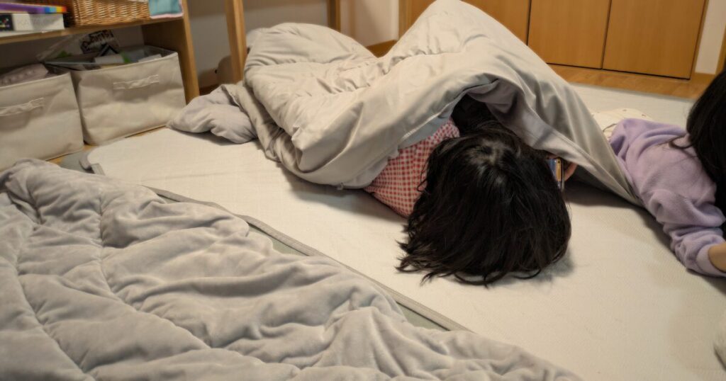 子ども二人と私が一緒に寝ています。